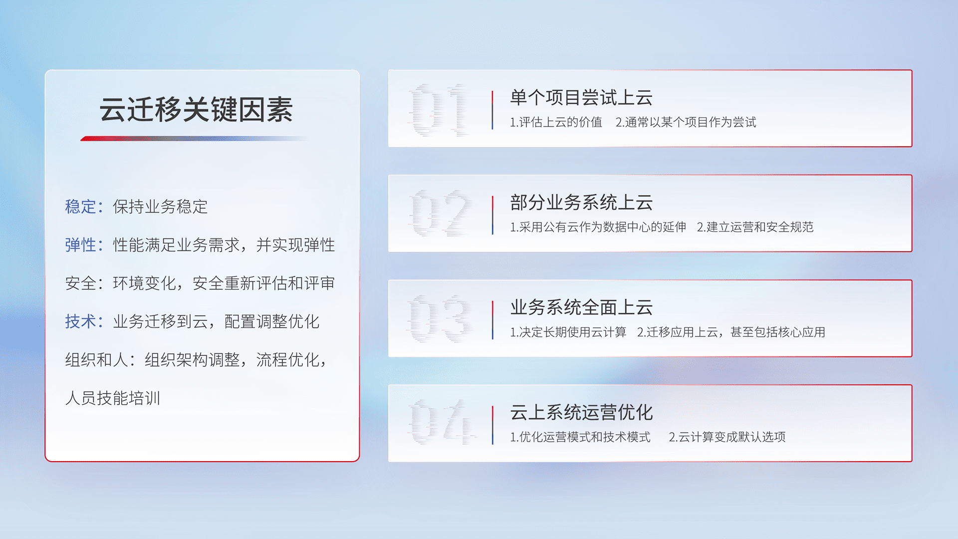 结合实际业务,,,,从规划设计、、、、云平台选型、、、、云原生改造、、数据迁移、、、集成交付,,,迁移全过程为客户识别最佳上云路径,,,做好风险识别管理,,,,设计网络架构、、、、身份权限、、、安全审计合规、、、、操作审计、、日志审计、、、监控告警策略、、、、多站点容灾设计等,,,对云上基础设施进行整体规划,,,,提升IT治理水平,,,以满足弹性、、、、高可用、、高性能的需求。。。。